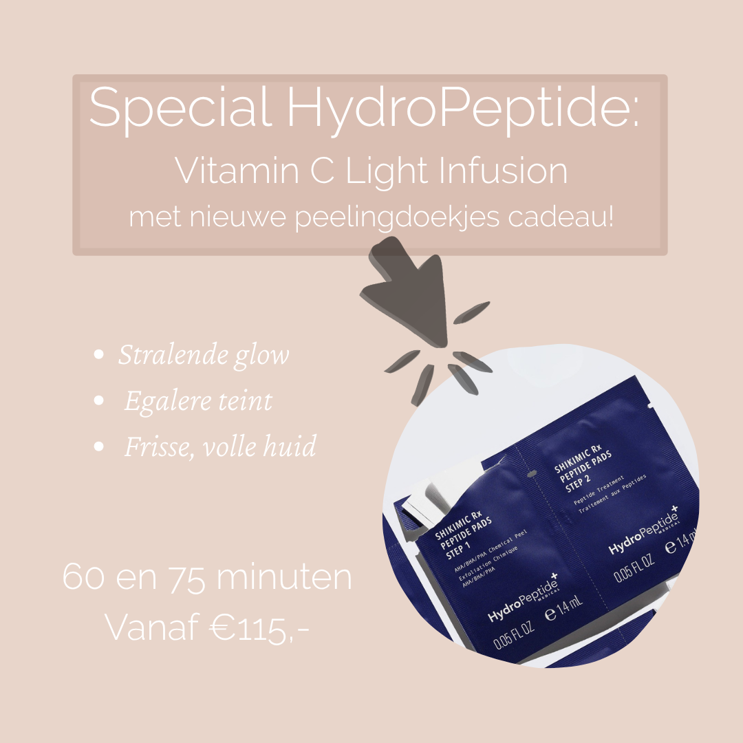 Geef je huid een krachtige oppepper met onze nieuwste Hydropeptide special: Vitamin C Light Infusion. Deze intensieve behandeling zorgt direct voor een frisse, egale en stralende huid.
